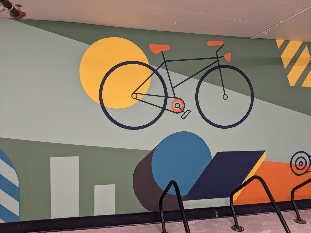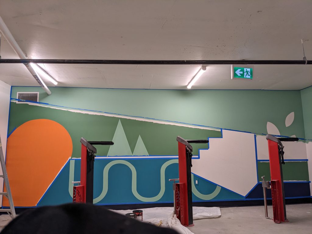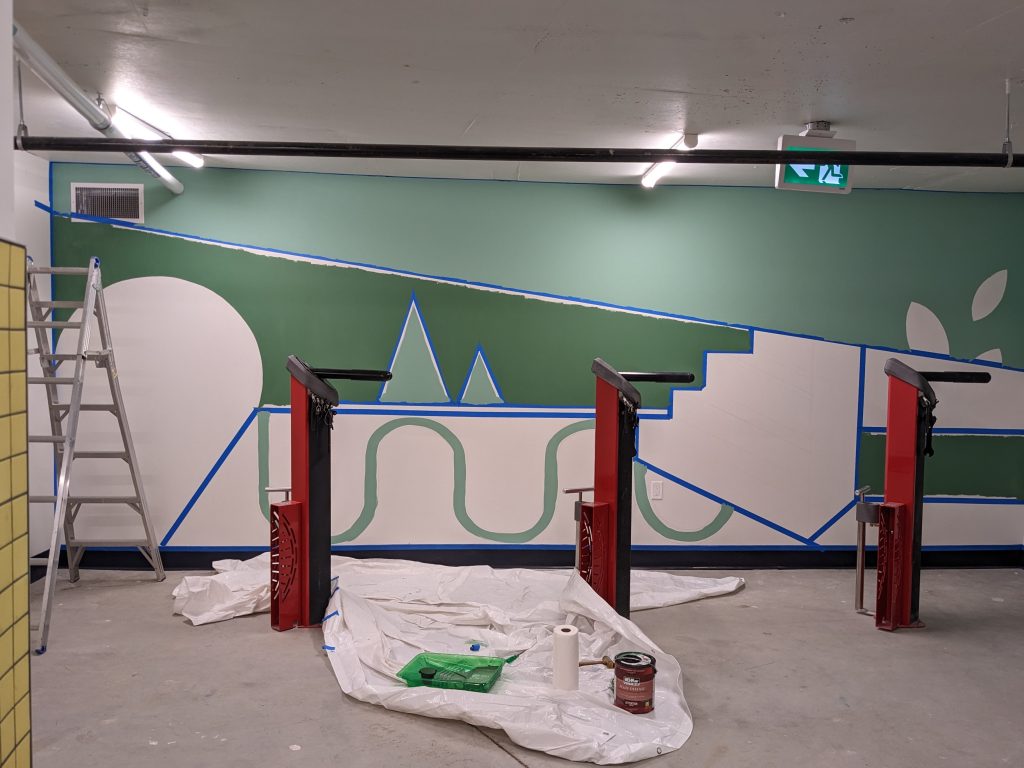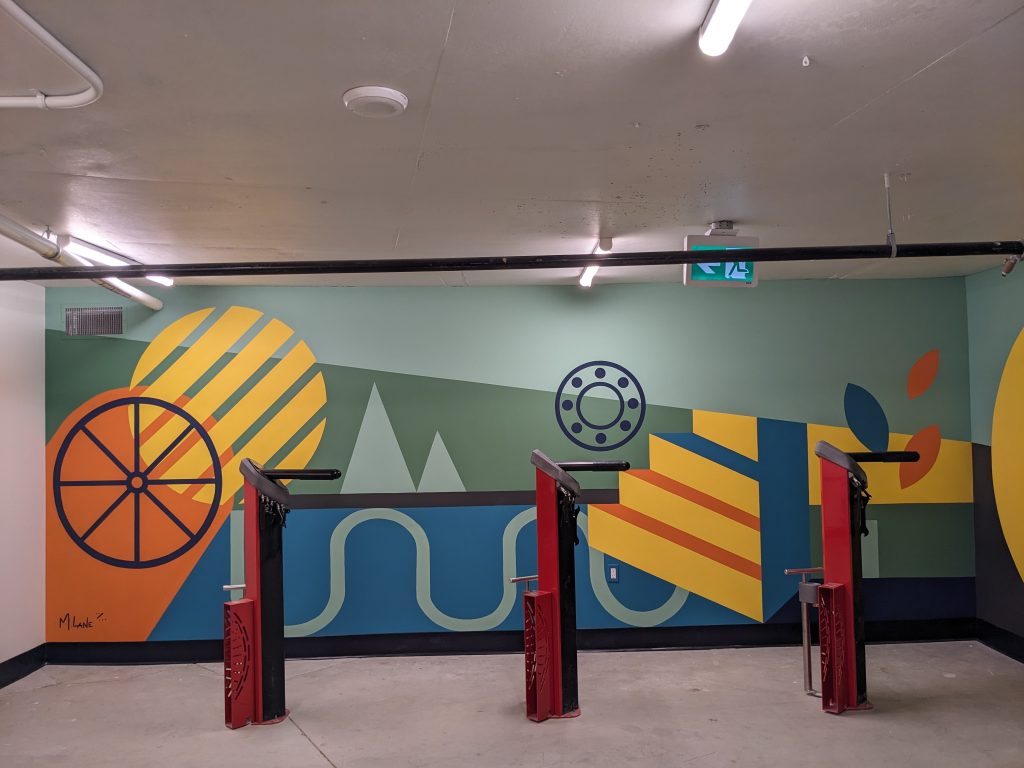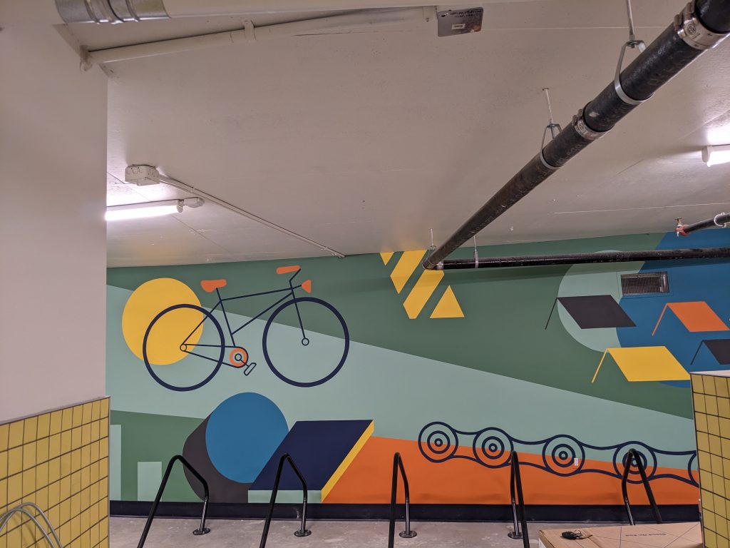 ASPAC Developments Ltd. wanted a mural for their River Green complex to bring some colour and sophisticated playfulness to the two largest walls of their bike storage and repair room. The mural began with a digital mock-up: