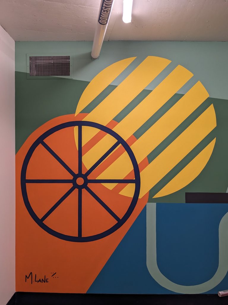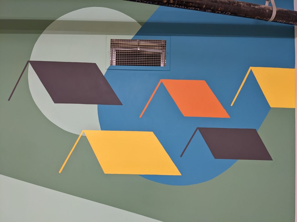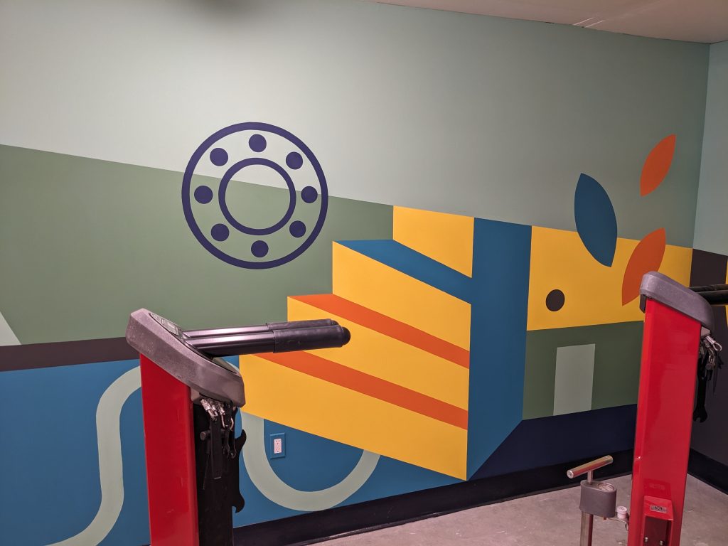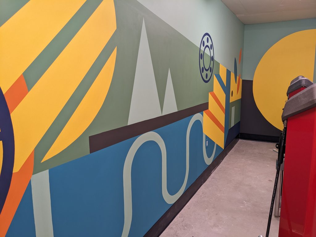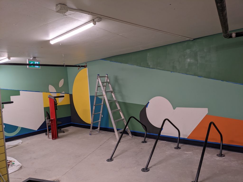 ASPAC Developments Ltd. wanted a mural for their River Green complex to bring some colour and sophisticated playfulness to the two largest walls of their bike storage and repair room. The mural began with a digital mock-up:
