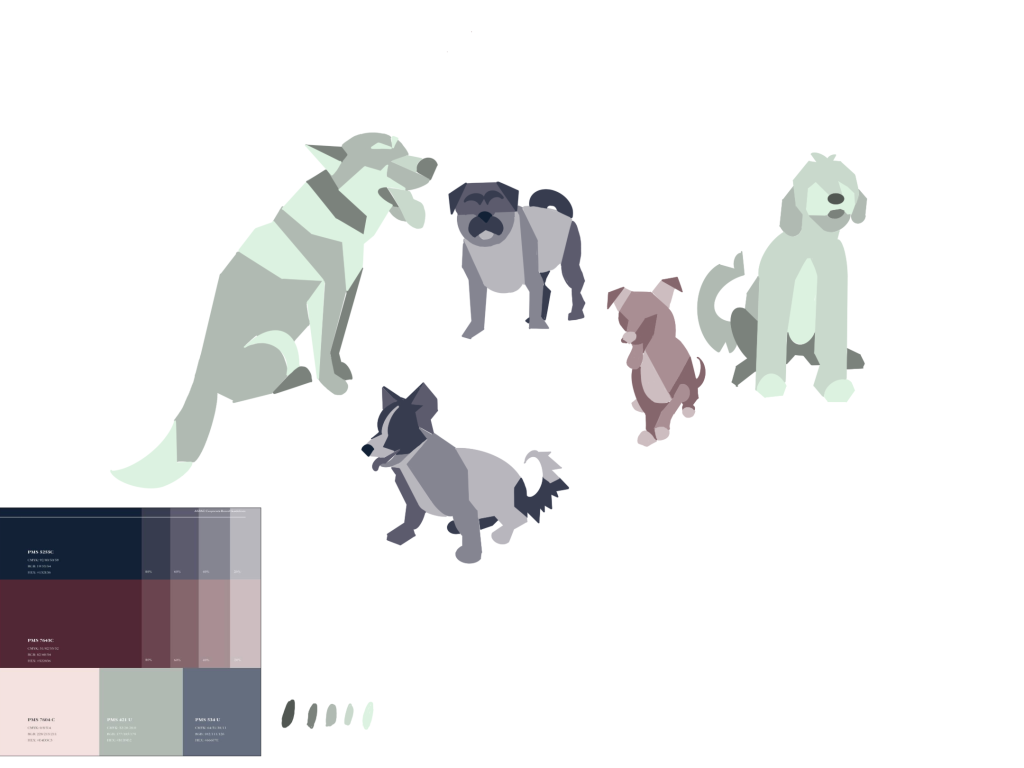 The design went through multiple iterations. The first draft was a colourful, retro, and whimsical style that could be described as pop-art meets mid-century modern. This design featured dogs of ASPAC employees: