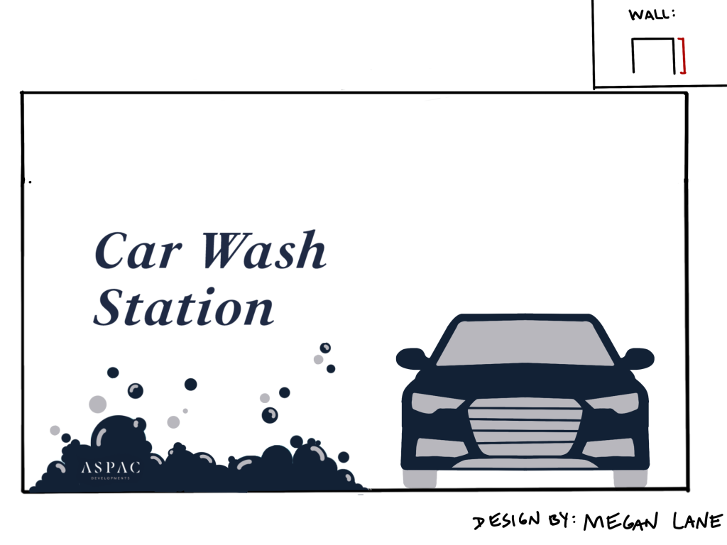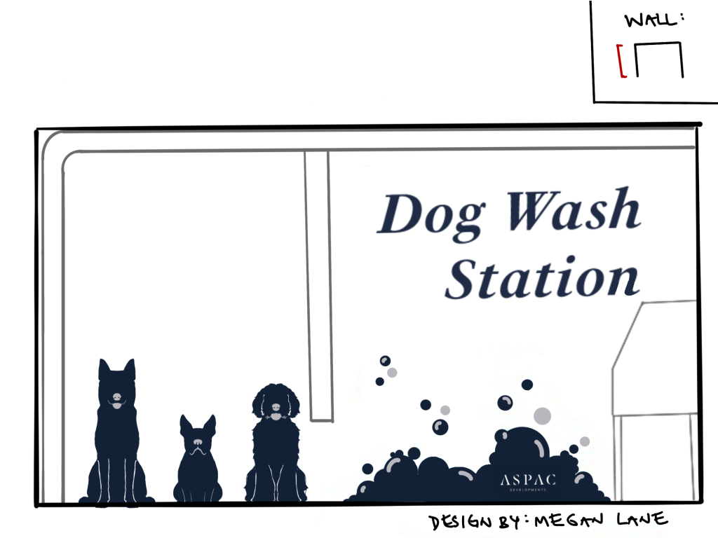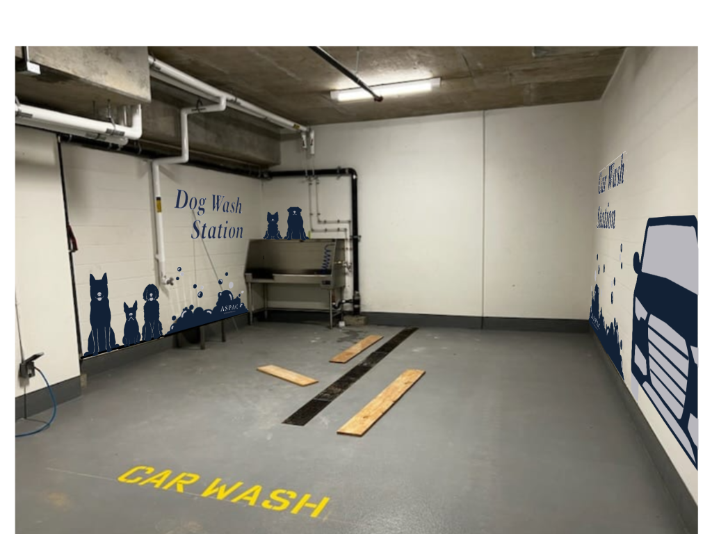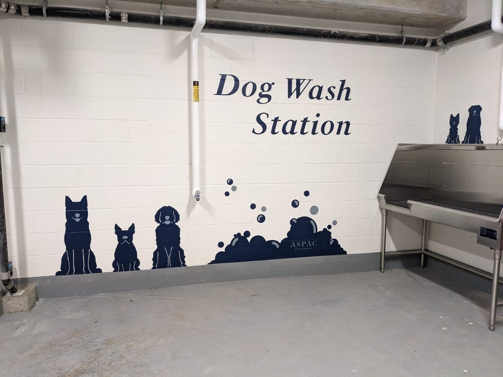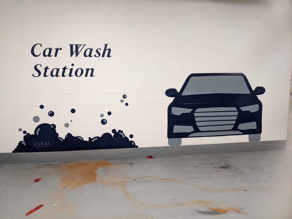 ASPAC Developments Ltd. wanted a mural to give some visual interest to their underground parkade, as well as a way to demarcate their unique dog and car wash stations.